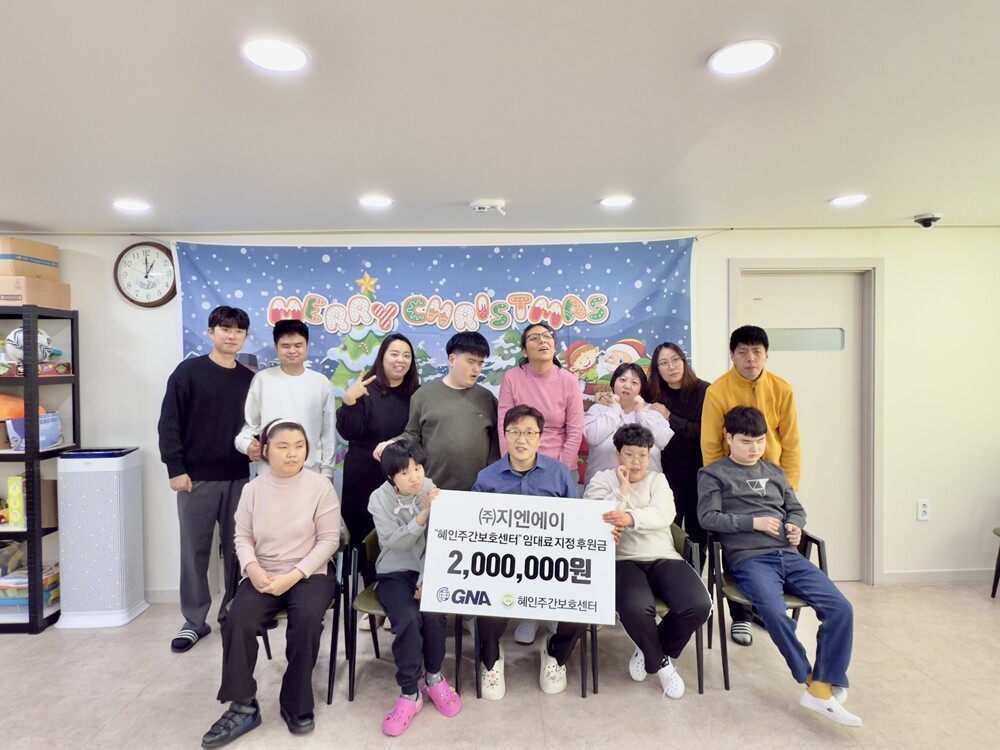 (주)지엔에이는 연말연시를 앞두고 강남 드림빌과 혜인주간보호센터를 방문해 후원금과 물품을 기부하는 전달식을